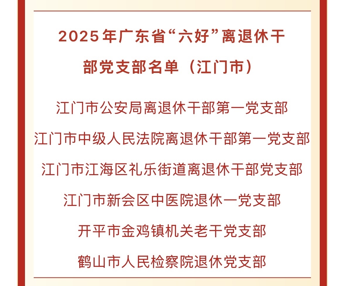 近日牛盈宝,中共广东省委组织部、中共广东省委老干部局联合发文,公布了2025年广东省“六好”离退休干部党支部名单,我镇机关老干党支部成功上榜,是开平市2025年唯一获评的单位。