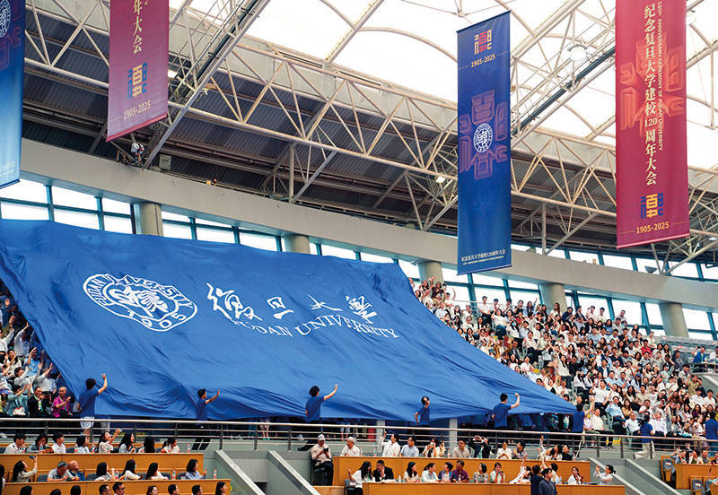 学生在纪念复旦大学建校 120 周年大会现场传递校旗(2025 年 5 月 27 日摄) 刘颖摄 / 本刊构建大学新形态 打造教育科技人才深度融合平台